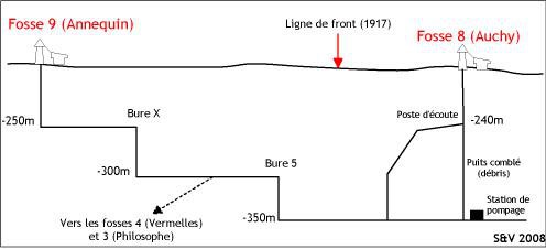 Coupe schématique des galeries et puits entre les fosses 8 et 9. Les distances en x ne sont pas respectées.