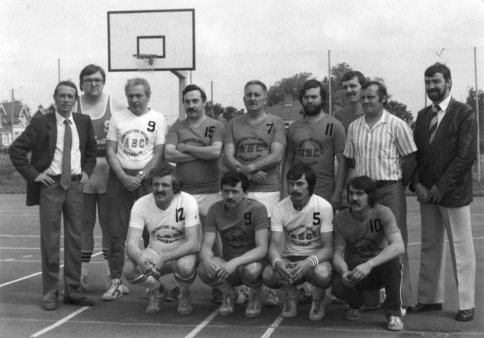 Les Vétérans à l'occasion du jubilé d'André Bouquillon en juin 1982 De gauche à droite rangée du haut Jean-Pierre Brunin, François Golabek ,Jean-Luc Lipscomb , Yves Boidin, Jean Nivesse, ,Loison Cyriac, Marcel Poupart,André Bouquillon Rangée du bas J.B Plet, J.L Zamorski, Marcel Vanius, Gérard Laurent