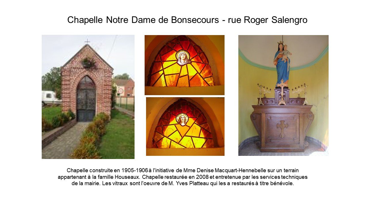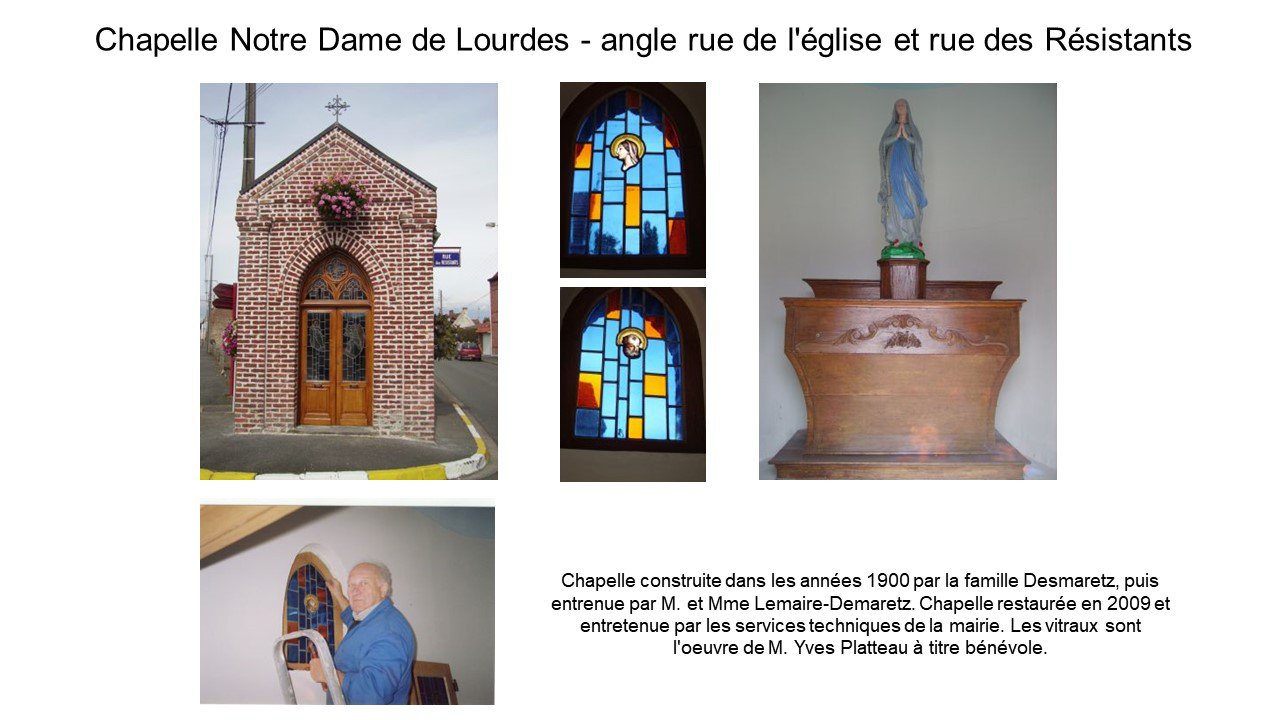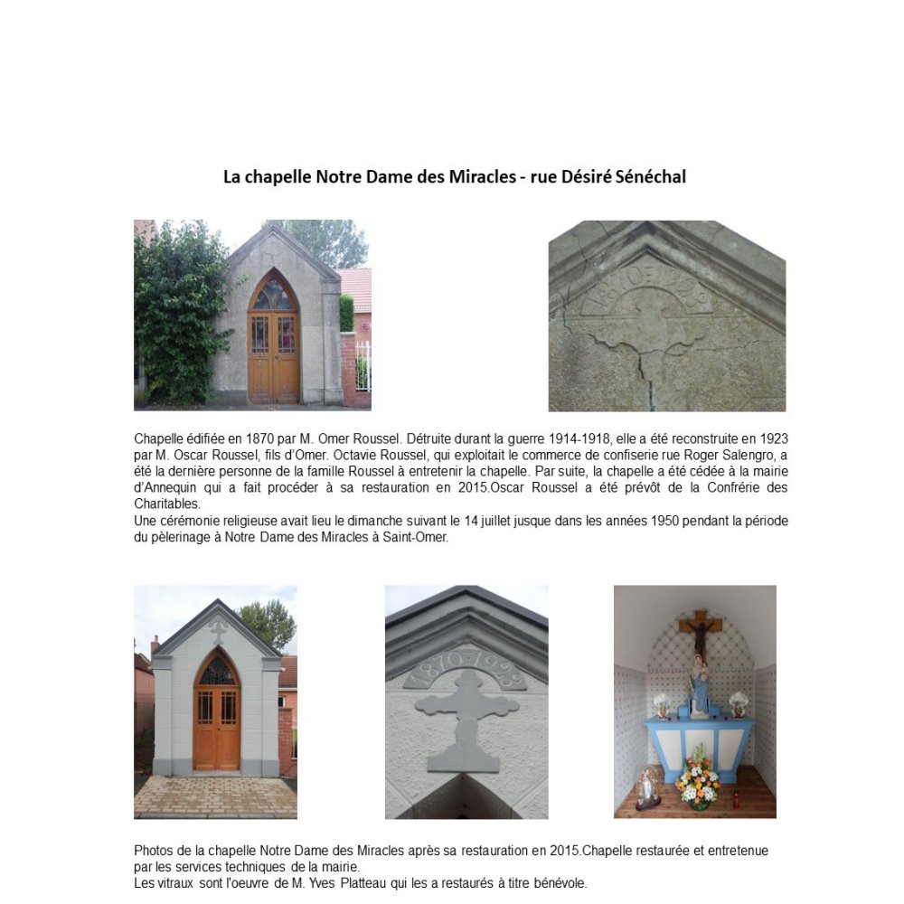 Juin 1952. Cinquante deux personnes participent au pèlerinage de Lourdes. Au cours d’un repas, l’idée de construire une grotte à Annequin est lancée par l’abbé Maurice Boulanger, curé d’Annequin. Tous les participants partagent cette idée et décident de ramener dans leurs bagages des cailloux ramassés au bord du Gave de Pau. Cinquante deux personnes, soit autant de cailloux. Ils ont été assemblés au pied de la grotte qui a été bâtie, avec l’appui d’un cimentier, avec des pierres apportées par les agriculteurs dans leurs remorques. Commencée le 1er juillet, la grotte est terminée mi-septembre. Deux statues sont implantées : celle de Sainte Bernadette, protégée par une grille, et celle de Notre Dame de Lourdes. Quasiment un miracle ! La bénédiction de la grotte a lieu le 5 octobre 1952 par Monseigneur Lacroix, vicaire général. 400 personnes participent à la cérémonie. Jusqu’aux années 60, la procession démarrait d’une chapelle pour arriver à la grotte. Depuis lors, un rassemblement marial est organisé le 15 août de chaque année devant la grotte. C’est l’occasion de sortir la relique de Sainte Bernadette, en l’occurrence un cheveu, demandée par l’abbé Boulanger au carmel de Nevers pendant la construction de la grotte. La municipalité se charge de l’entretien de la grotte, qui n’est plus mise en couleurs pour se rapprocher de la grotte de Lourdes.
