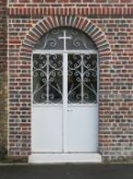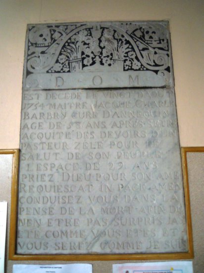 A l'entrée de l'église, il existe une plaque funéraire datant de la seconde moitié du dix-huitième siècle. Elle porte l'inscription: " Est décédé le vingt août 1754 Maître Jacques Charles Barbry Curé âgé de 58 ans après s'être acquitté des devoirs d'un pasteur zélé pour le salut de son peuplel'espace de 29 ans. Priez Dieu pour son âme Requiescat in pace Amen Conduisez-vous dans la pensée de la mort afin de n'en être pas surpris J'ai été comme vous êtes et vous serez comme je suis". Le message est clair! Conduisez-vous en bon chrétien car la mort peut arriver à tout moment et vous serez jugé. On peut remarquer la représentation du passage dans l'au-delà qui exprime ce même passage. En haut de la plaque, de part et d'autre, les crânes et ossements symbolisent la vanité des plaisirs terrestres, le destin inéluctable de l'homme, l'aspect éphèmère de la vie sur terre. Les pelles évoquent l'enterrement . La faux est, bien entendu, l'un des symboles de la mort. Il faut noter que ces éléments se trouvent séparés du reste de la composition par une ligne. On trouve souis cette ligne, les recommandations à suivre pour accéder pour accéder au paradis: