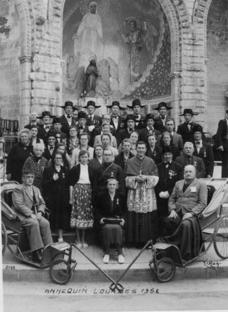 Le groupe de pélerins à Lourdes en 1952 autour de Monseigneur Parenty, évêque d'Arras et de l'abbé Boulanger, curé de la paroisse.