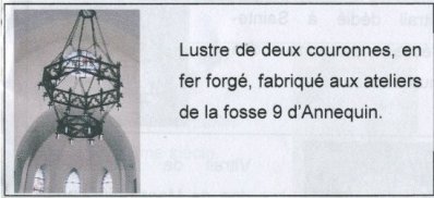 Reliquaire de Saint Jean-Baptiste, patron de la Confrérie des Charitables depuis le XVII ème siècle Baptistaire en pierre provenant de l’ancienne église. Christ naïf style baroque provenant de l’ancienne église, mis en valeur sur une croix récente. Retable du maître autel, en chêne, réalisé après la reconstruction de l’église, par Monsieur Daniel Thorel de Beuvry, et représentant la mise au tombeau du Christ. Deux lustres de deux couronnes, en fer forgé, fabriqués aux ateliers de la fosse 9 d’Annequin. La statue de Sainte-Wilgeforte.