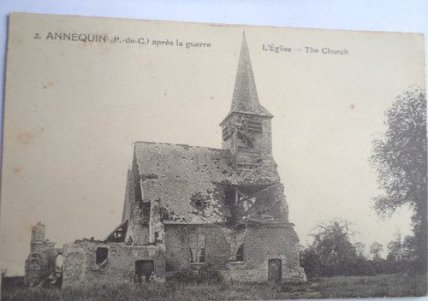 L'Histoire La cure d’Annequin, après avoir appartenu à l’abbaye de Saint Denis en France, a été échangée, entrant dans les possessions de l’archevêché de Cambrai. L’ancienne église comportait une chapelle latérale dite « chapelle Madame », en souvenir du dernier Seigneur. Sous cette chapelle se trouvait une crypte où étaient inhumés les Seigneurs d’Annequin. Elle a été construite vers 1600 par Charles Blangerval, seigneur du pays et à usage de chapelle pour le château qui existait à côté. Une pierre porte, gravée dans l'écriture du temps "Charles BLANGERVAL.1634". Lors de la reconstruction après la guerre 1914-1918, la surface a été agrandie de près de moitié.Les bas côtés ont été supprimés; une seule grande nef a été faite. Le choeur trop profond a été élargi et ramené dans l'axe. La sacristie a été également agrandie et des dégagements d'accès direct à l'église et au choeur ont été prévus. L'air et la lumière pénètrent par de nombreuses baies dans toutes les parties de l'église alors que l'ancienne n'était que très faiblement éclairée. L’actuelle église paroissiale est couverte de tuiles pour l’essentiel. La nef est composée de trois travées, la dernière étant prolongée vers le sud, par un porche ou une chapelle. Elle paraît surmontée d’une flèche de charpente à trois étages d’abat-son et couverte d’ardoises. L’église telle qu’on la voit maintenant a été reconstruite après la guerre 1914-1918, en 1925. Le 8 juin 1922, le conseil municipal a décidé la reconstruction de l’église. Sous la direction de MM. Pelleray et Barrault, architectes à Béthune, les travaux de gros œuvre ont été effectués par l’entreprise Piquart, de Noyelles-les-Vermelles. La cloche a été réalisée par les Ets C. Wauthy, de Douai. L'église actuelle est consacrée à Saint Martin. Un saint originaire de l'actuelle Hongrie, il devint légionnaire romain et fut envoyé en garnison à Amiens. Il est célèbre pour avoir partagé son manteau avec un mendiant.