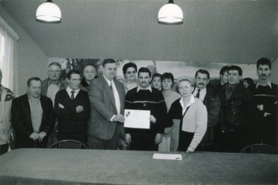 Remise d'un chèque de 10.000 Frs à M. Pollet, pharmacien à Béthune ainsi que des sapeurs pompiers lors du premier téléthon organisé en 1992 par les sapeurs pompiers et d'autres associations, en présence de Mme Angèle Chavatte, maire, et d'autres représentants du conseil municipal..